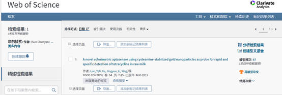 为第一作者单位,在食品领域TOP 期刊“FOOD CONTROL”期刊发表论文《A novel colorimetric aptasensor using cysteamine-stabilized gold nanoparticles as probe for rapid and specific detection of tetracycline in raw milk》,到 十一月/十二月 2019 为止,受到引用的次数已将其归入其学术领域中最优秀的 1% 之列,入选“ESI高被引”。(全文链接: )