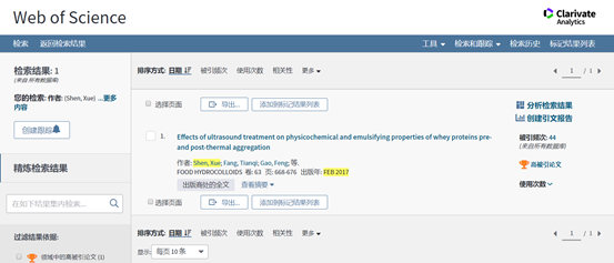 为第一作者单位,在食品领域TOP 期刊“FOOD HYDROCOLLOIDS”期刊发表论文“Effects of ultrasound treatment on physicochemical and emulsifying properties of whey proteins pre- and post-thermal aggregation” ,到 十一月/十二月 2019 为止,受到引用的次数已将其归入其学术领域中最优秀的 1% 之列,入选“ESI高被引”。