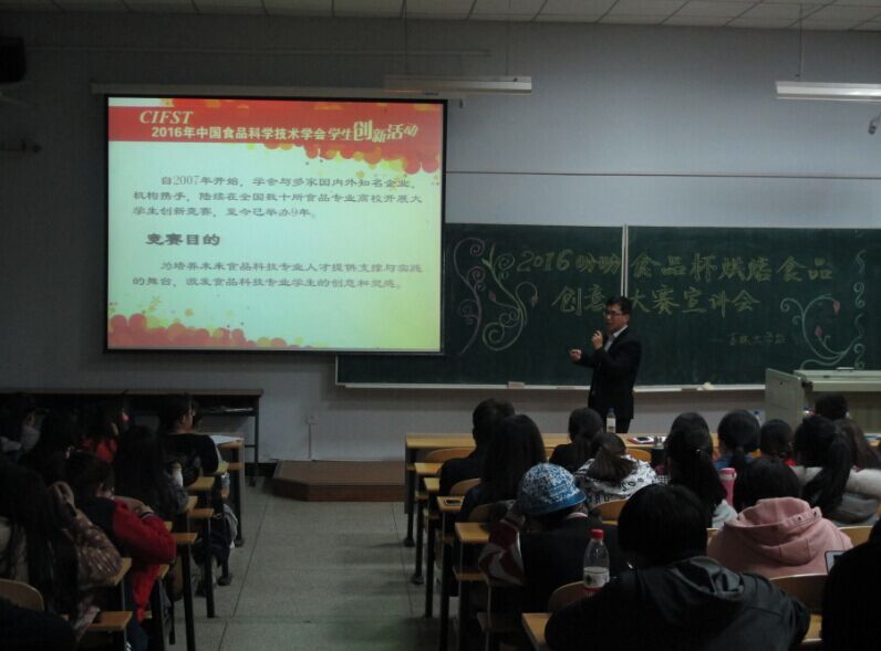党委副书记梅士伟、食品科学与工程专业潘风光教授、学院综合办公室马爽以及2013级辅导员师小达出席了本次宣讲会。 宣讲会伊始,学院党委副书记梅士伟首先对中国食品科学技术学会侯威先生和盼盼食品集团研发中心高级工程师张冶先生的到来表示热烈欢迎,并向两位嘉宾介绍了学院的简要情况。他表示,校园竞赛的开展对于每一位同学来说都是一个良好的锻炼自己,开拓创新的机会,他对同学们寄予厚望,希望同学们能够积极参与本次大赛,激发创新能力的同时增强团队意识,为我国食品工业的长足发展贡献力量。 随后,来自中国食品科学技术学会的侯威工程师介绍了学会概况,学会学术交流情况、在食品安全工作中承担的重任、在公众科普中发挥的重要功能、承接的政府职能、出版的刊物以及学会举办的各项大学生创新大赛。并详细解读了本次盼盼食品杯烘培食品创意大赛的竞赛细则,包括竞赛方向、竞赛主题、参赛资格、奖励机制以及赛制流程。来自盼盼食品集团研发中心的高级工程师张冶先生以一段盼盼集团宣传片带领同学们领略了家喻户晓的盼盼集团,并从烘培行业现状、大赛主题方向、创意命题剖析、盼盼产品展示以及往届作品展示五个方面对同学们进行了技术指导。 最后,在提问答疑环节,同学们针对产品创意设计、专业技术难点、竞赛主旨等方向积极提问,两位嘉宾分别作了细致而精彩的回答,使同学们受益匪浅。 通过此次校园宣讲会,同学们对2016年盼盼食品杯烘培食品创意大赛有了更为深刻、清楚的认识,也增加了同学们的信心和斗志,在此预祝所有的参赛队伍能够披荆斩棘,再创辉煌,取得佳绩!