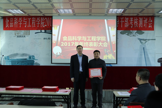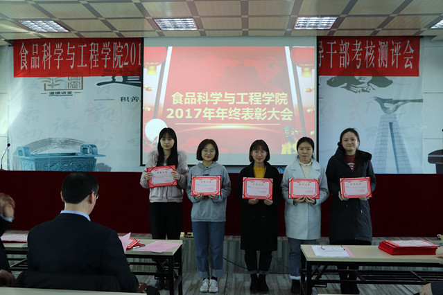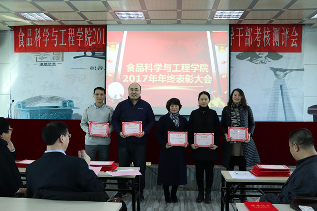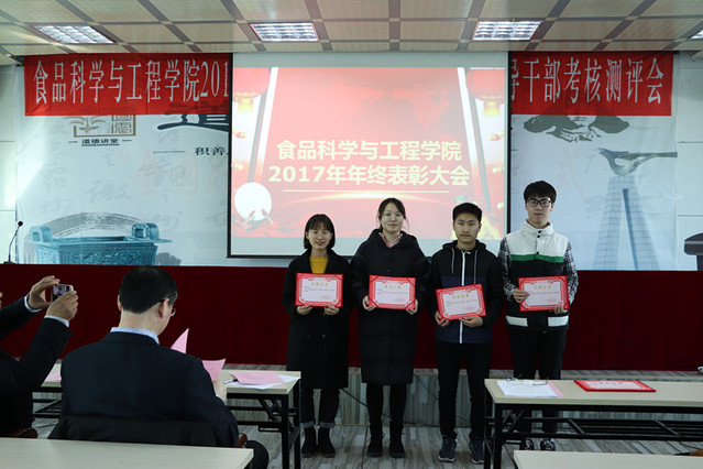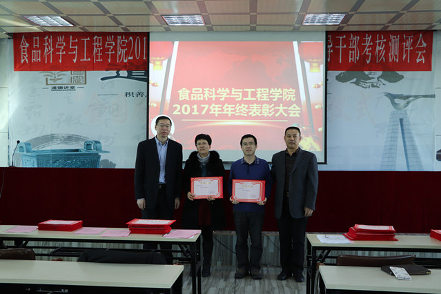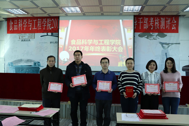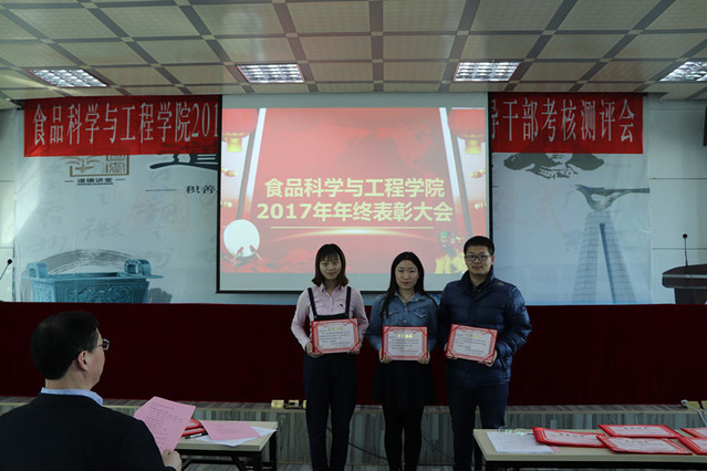 消防先进单位、个人表彰决定”、庄红副院长宣读“食品科技青年论坛获奖情况的通报”、周亚军副院长宣读了“关于2017年本科生学术年会获奖情况和优秀学生奖励的通报”。大会对一年来表现突出的单位、教师和学生进行了表彰。