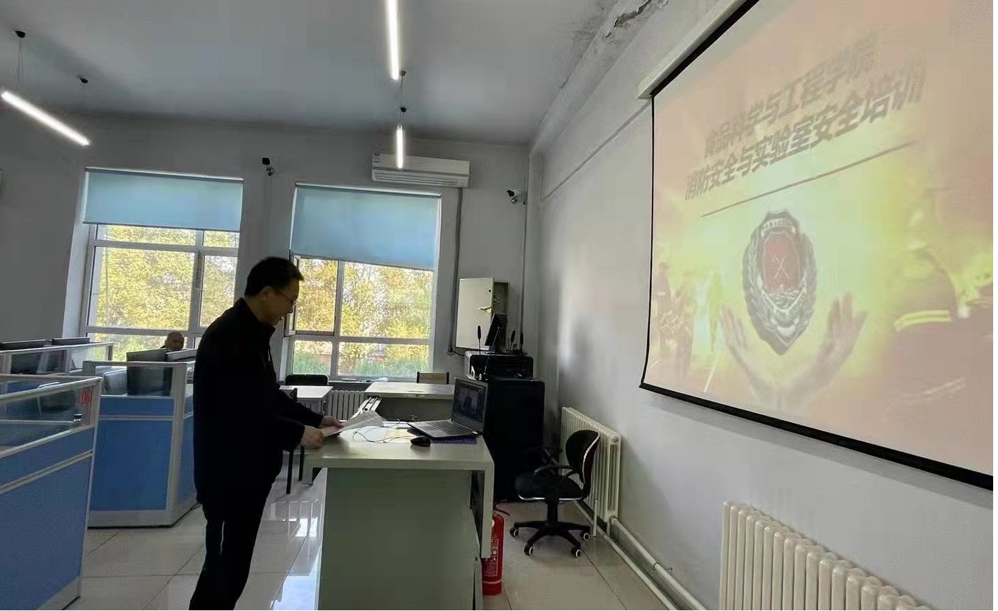 在食品楼三楼机房315召开消防安全与实验室安全培训线上会议,周亚军副院长、陈玉江副院长、保卫处任亚峰、叶天春老师、实验中心王二雷老师、研办王军老师以及全体2021级研究生参与会议。