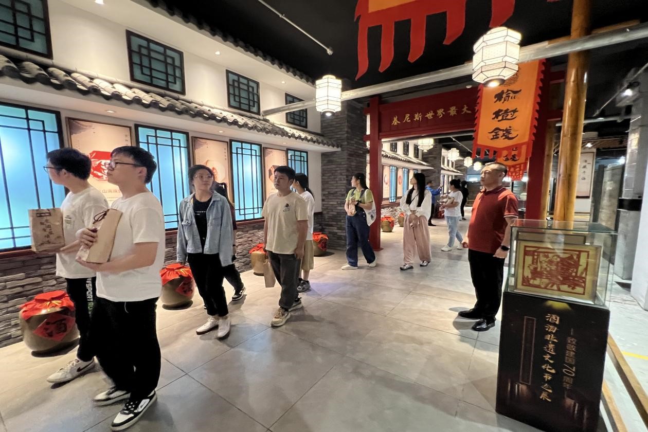 “老人七十仍沽酒,千壶百瓮花门口。道傍榆荚仍似钱, 摘来沽酒君肯否?”榆树钱酒文化可追溯至唐代,吉林省榆树钱酒业有限公司位于素有“天下第一粮仓”之美誉的榆树市。实践团队抵达公司后,在工作人员的带领下,参观了由八个主题展馆构成的榆树钱酒业酒文化博物馆,包括饮水思源、榆树故事、珍宝馆、墨宝寄情、红色基因、榆树老街等;了解到了榆树钱酒起源于1812年,七代传承,二百年工艺,其酿造技艺已列入吉林省非遗;品尝了榆树特色小吃干豆腐、体验了自助调制白酒,在勾调过程中,师生们亲自动手用两种原酿基酒和酸、甜、陈、香四种调味基酒勾调出自己专属口味的白酒;随后,实践团队来到了榆树钱酒业的酿造车间,品尝了刚出锅的原浆酒和独特口感的酒糟鸡蛋。榆树钱老窖池工艺拥有国家专利,窖池中庞大的微生物菌落群所产生的的酸类、酯类等物质决定了白酒的整体风格。正是榆树钱酒业在悠久的酒文化历史底蕴和传承精髓的基础上与时俱进,才成为醇厚绵甜、甘冽爽净的北派香型代表;最后,实践团队参观了酒海群、私人酒窖,解说员讲解到榆树钱酒海采用长白山百年以上树龄的优质黄花松木,辅以麻纸、鹿血等制成168层内胆,历经100多道工序,纯手工制作300多个时日。基酒经酒海贮藏再入陶坛贮藏后,具有独特的“美人松香”、“老酒陈香”、“蜂蜜甜香”等融合的酒海香型。榆树钱酒业的私人酒窖被誉为“北方最大私人酒窖基地”,在这里可以定制、封坛榆树钱原浆美酒,并把回忆和祝福注入其中,让美好祝愿在岁月中发酵。