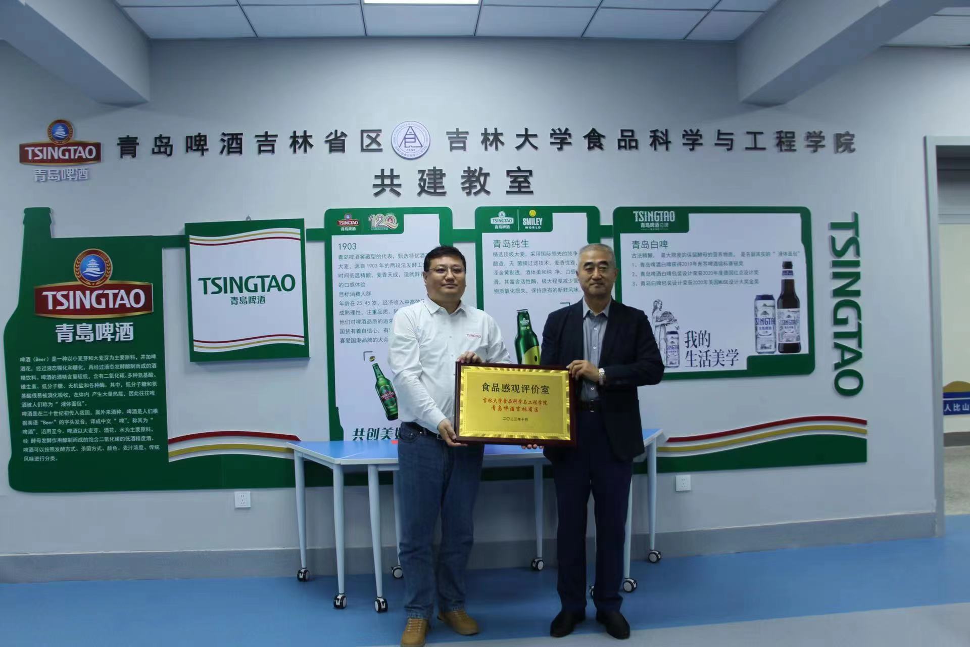 青岛啤酒(吉林省区)是负责总公司在吉林省营销业务的派出机构,为了更好的促进食品行业领域的人才储备,企业投入了10余万元为该教室进行了全面装修和配套,配置了智能黑板、VR智慧系统、移动桌椅、空调和青岛啤酒全系列产品。签约仪式上,赵雪刚总经理为大家介绍了青岛啤酒的发展历程和重要的产品种类,希望以此次共建教室为契机加深合作,共同发展,加强高校学子对啤酒领域认知,期待更多的吉大毕业生加盟青岛啤酒。张铁华院长表示校企合作为双方提供了一个良好的平台,符合社会发展的方向和学校与企业的双方需求,并明确了下一步合作的空间。董怀智书记总结讲到,感谢青岛啤酒对学院教育教学的支持和投入,希望可以加强合作充分发挥学校与企业的双方优势,为国家和企业提供高素质的应用型人才,助推行业领域的发展。