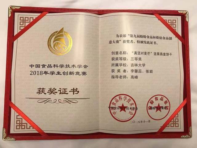 “醋之元”功能型粉剂饮料获恒顺香醋杯学生创新大赛二等奖、“触动·醋冻”获恒顺香醋杯学生创新大赛最佳工艺奖、“真坚对麦芒”坚果燕麦饼干获第九届盼盼食品杯烘焙食品创意大赛三等奖,学院16级学生李馨蕊、张岩受邀领奖。