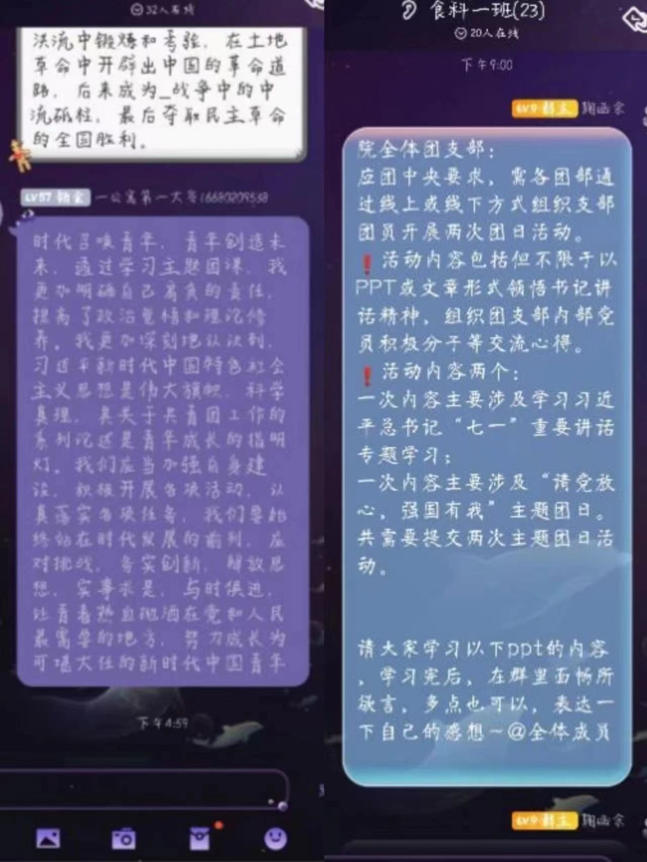会议伊始,主持人通过班级群向同学们展示了团旗的内涵及党史学习PPT,并提供相关资料供同学们学习。随后,同学们以寝室为单位小组进行了讨论,讨论气氛十分热烈。最后,同学们通过腾讯会议实现了与团旗的合影,并将感受记录留存。相信通过此次讨论会,同学们能更好地抓住党史学习教育的契机,把党的历史学习好、总结好,把党的成功经验传承好、发扬好。