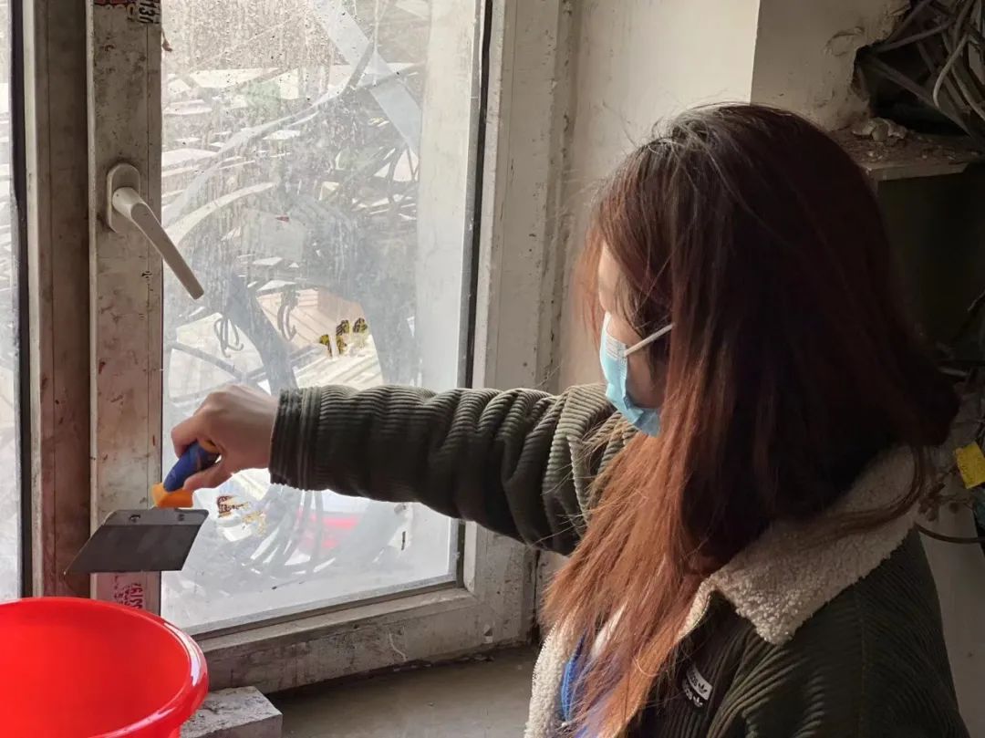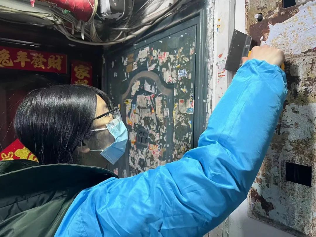 随后,同学们在社区工作人员的指导下三人一组前往铁路社区居民楼进行小广告清除,通过近一个小时的劳作,同学们合理分工、相互配合,铲除了五个单元内墙面、楼梯、管道上的广告纸,并对部分墙面进行重新喷涂。韩书记表示,此次志愿活动有效改善了社区容貌,消除安全隐患并净化公共环境,韩书记鼓励同学们把握实践机会,勤思考,多动手,在生活中处处为人民着想,充分发扬雷锋精神。