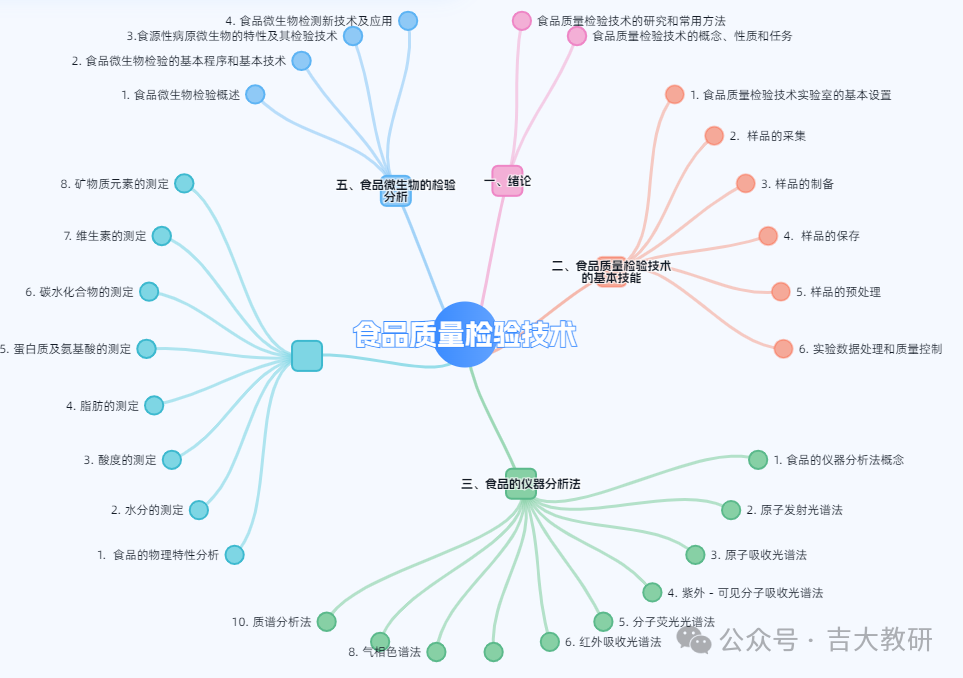 通过人工智能算法对教学内容进行智能分析,分类知识点的重点和难点,挖掘理论知识点之间的内在联系,形成清晰、高效、动态的可视化知识网络图谱,知识图谱如图3。结合任务引擎“驱动”活动,导入食品安全法规、职业道德案例、前沿技术、仪器操作视频、在线开放课程等线上资源,动态更新教学内容,保持课程鲜活度与适配性。同时以“问题/项目”为纽带,串联学、练、测、评全流程,智能辅助学习。例如,针对“光谱分析”这一知识点在不同学科中的不同应用,设计跨学科融合的教学模块,强化知识关联性和实际应用性,为学生提供一个系统化、高效的知识学习框架,帮助学生建立系统化知识体系和职业责任感。引导学生主动“学习、思考、讨论、实践、探索、感悟、创新”,实现“专业技术探究、创新能力培养、责任价值塑造”三位一体的教学目标,落实高校立德树人的根本任务。