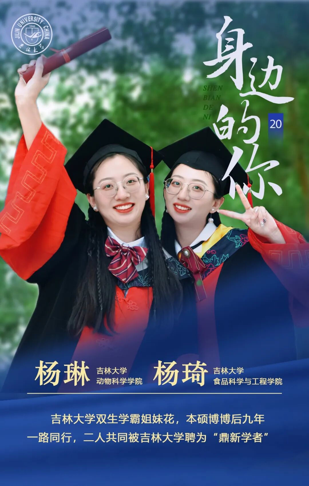 ,从本科到博士,始终并肩前行。她们的成长轨迹,恰似两棵并肩而立的绿树,根脉交织,枝叶共荣,在吉大的沃土上书写着“双生如树”的青春篇章。