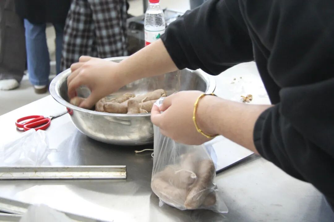 活动过程中,两院学生充分发挥专业特长,分组协作,从原料预处理、搅拌腌制,到灌肠、扎线、蒸煮、烘烤,配合默契,氛围热烈且有序。在香肠蒸煮烘烤时,同学们充分利用等待时间,亲自动手制作了蛋挞。香肠制作完成后,两院同学就香肠的口感、风味、制作过程进行交流讨论,彼此交换心得。