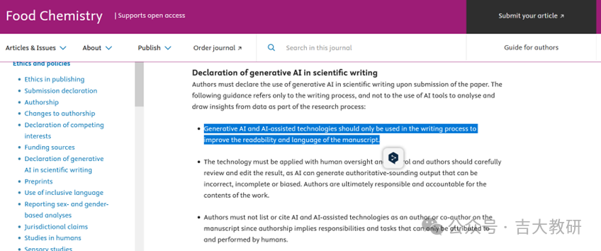 AI 工具可在学生完成论文稿件后提供多维度辅助,包括语法纠错、语言润色及文章质量提升。例如在实际操作中,学生在完成论文初稿后,可先用 Grammarly 排查语法错误,再通过 Turnitin 检测原创性,最后借助豆包 AI 优化语言表达(如调整句式逻辑、强化学术规范)。通过多工具协同,可系统性提升论文质量,满足国际期刊发表要求。需注意的是,部分顶刊(如食品领域期刊《Food Chemistry》)允许使用 AI 进行语言润色,但需在稿件中注明 AI 工具的使用情况,并确保内容的科学性与准确性。