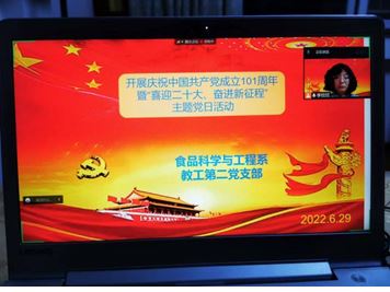 为了弘扬伟大建党精神,庆祝中国共产党成立101周年,迎接党的二十大的胜利召开,根据学校组织部《关于组织开展庆祝中国共产党成立101周年暨“喜迎二十大、奋进新征程”主题系列活动的通知》要求,按照学院统一布置,食品科学与工程系教工第二党支部于2022年6月29日晚上20:00~20:30,通过腾讯会议召开了“喜迎二十大,永远跟党走,奋进新征程主题党日活动。活动由李欣欣书记主持,全体党员参加。